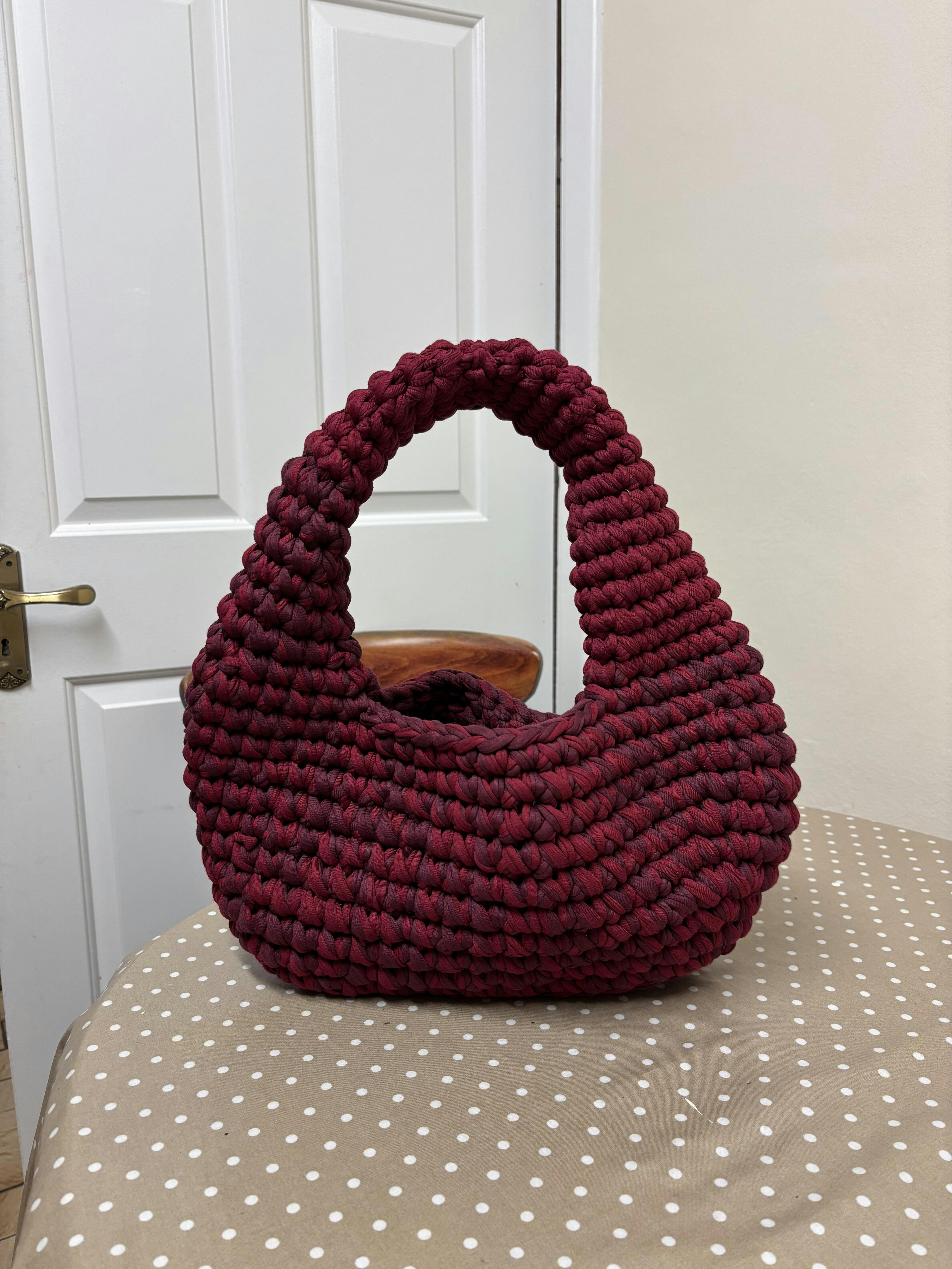 The Maxi Egg: 185m of T-shirt yarn (approximate). Width at widest point: approximately 16.5 inches. Length with strap: approximately 18 inches. 10mm hook.